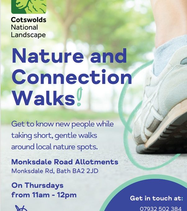 Thursday Wellbeing Walks are every Thursday at 11 am starting at Monksdale Road Allotments (BA2 2JD), from the car park. The walks are led by volunteers from Cotswold Voluntary Wardens and Bath Mind.