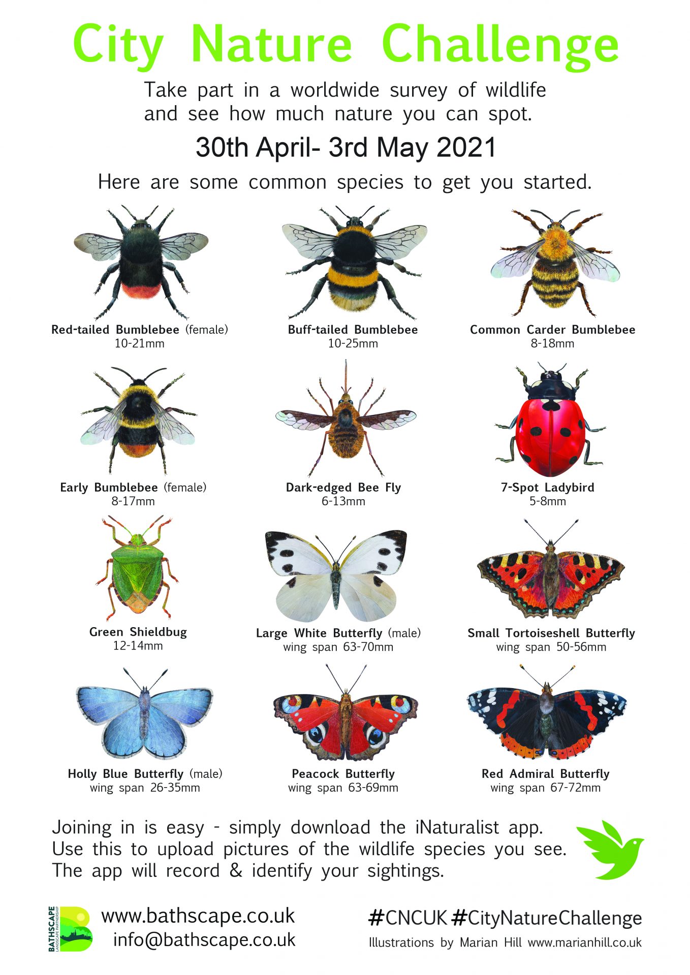 Local artist Marian Hill has created some wonderful resources to mark City Nature Challenge. The poster will be up in some of the Parks, and you can download the insect and minibeast versions to use for yourselves (or both on one pdf here). These are some of the insects you’re most likely to see during the weekend. You could also try the minibeast hunt.